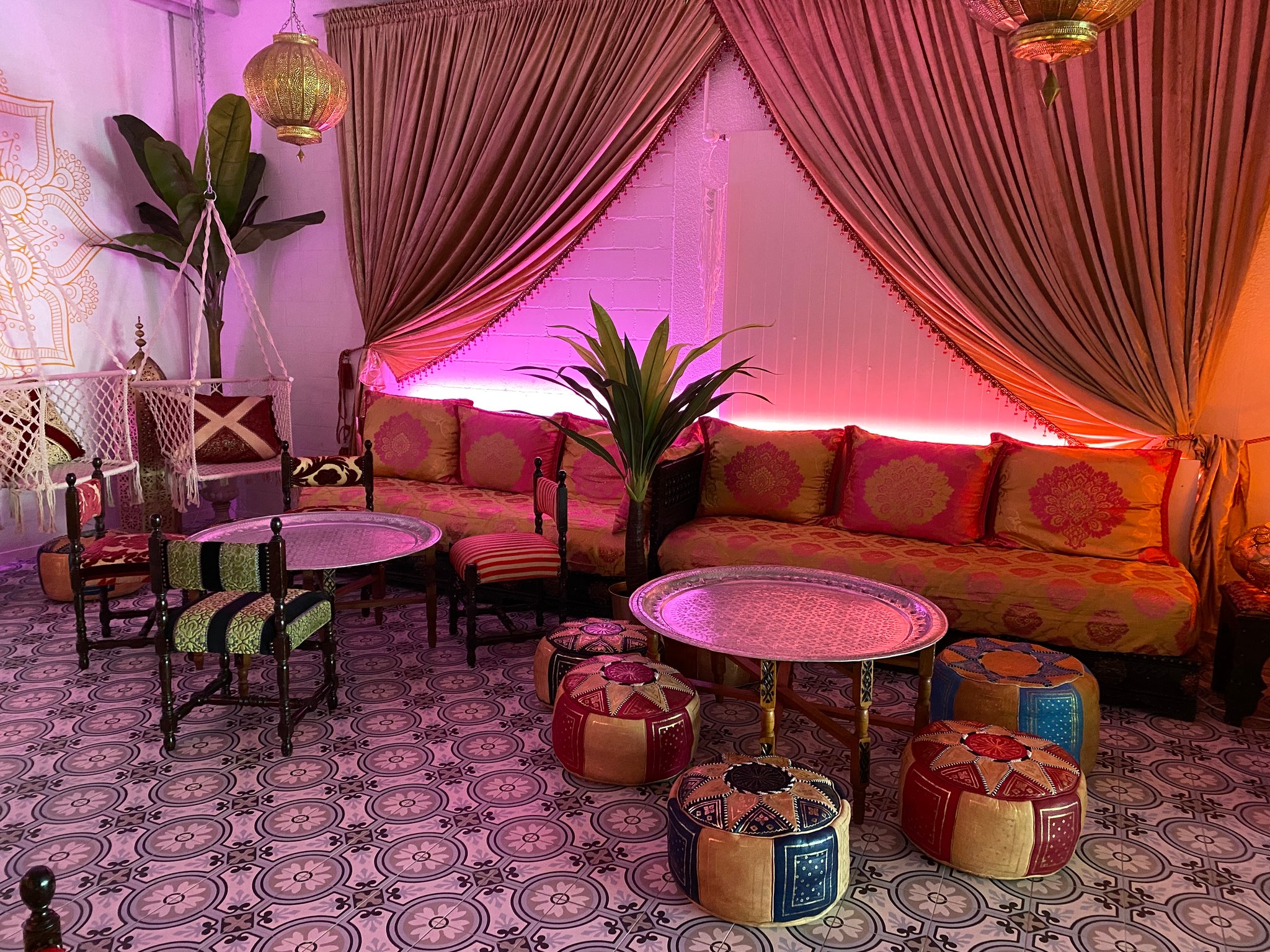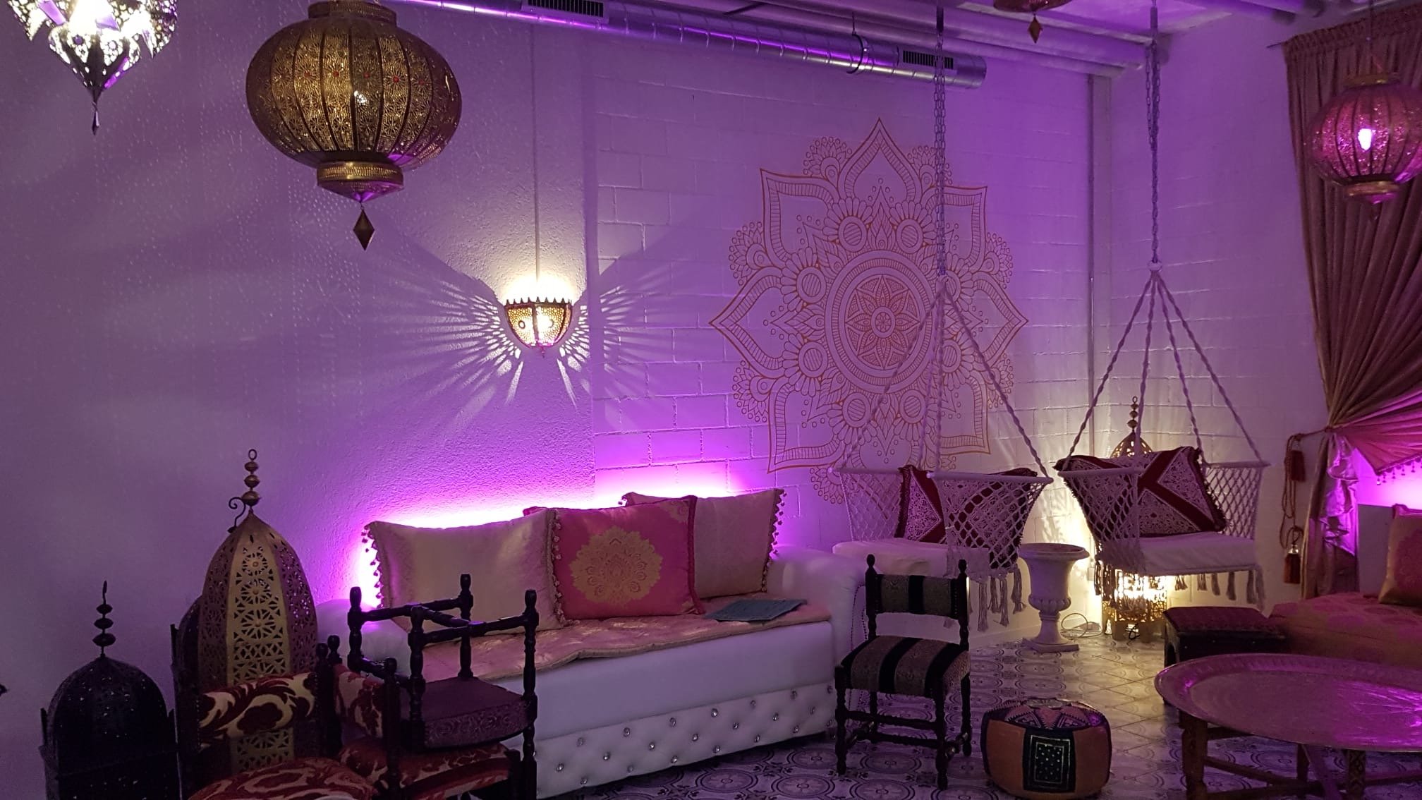 Die exotische und farbenfrohe Einrichtung mit schwebenden Sesseln und orientalischem Dekor bietet Platz für ca. 20 Gäste. Dein Event wird von unserem professionellen Team unterstützt, geplant und begleitet. Kulinarisch werdet ihr mit einem hauseigenem Catering von Samar-Event verwöhnt.